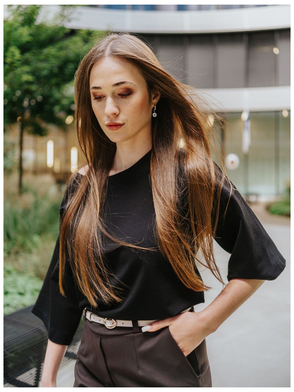 Oblékněte jednoduchost, která dokáže zaujmout. Top s volnějším střihem a širšími rukávy k loktům působí uvolněně, ale jakmile jej zastrčíte do kalhot, promění se v elegantní kousek s dokonale vyváženými proporcemi.